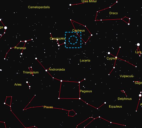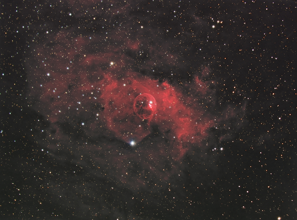 The Bubble is still expanding, but will not remain this regular for long. It is currently very young by cosmic standards at only around 300,000 years old. The Bubble Nebula sits in an area of sky dense with dust, measuring a total of some 35 light years across, from Earth a span of 15 arcminutes. However, the spherical Bubble itself is relatively small at only 2 arcminutes across, a width of about 5 light years.