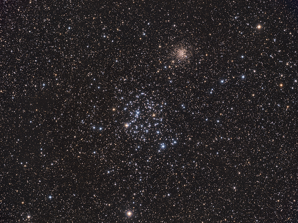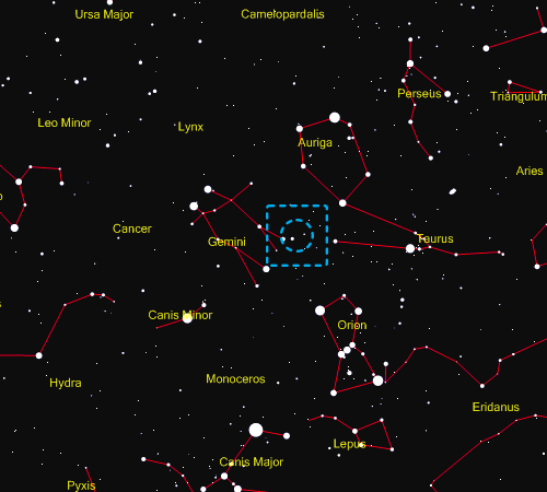 M35 is the only Messier object in Gemini and consists of several hundred stars, of which 120 are brighter than magnitude 13. The age of M35 is about 110 million years with the hottest main sequence stars in the cluster having a spectral classification B3. M35 also contains more evolved stars, including several orange and yellow giants. The cluster is approaching us at 5 km/s. M35 was first discovered in 1745 by a Swiss astronomer called Jean-Philippe Loys de Cheseaux, but John Bevis, an English astronomer, found the cluster independently before 1750. NGC 2158 was discovered by William Herschel on November 16, 1784 and catalogued as H VI.17.