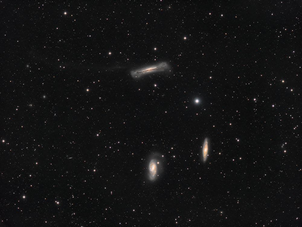 Starting at the top of the image we find NGC 3628, the Hamburger Galaxy. It is considered the most difficult galaxy in the Leo Triplet to observe and went undetected by Charles Messier at the time that he found M66 and M65, only to be discovered and catalogued four years later by William Herschel. The Hamburger Galaxy is known for its distinctly wide dust band, which obscures its central region and the areas of star formation in its spiral arms, and its huge tidal tail, extending some 300,000 light years to the galaxy's left. The tidal tail is comprised mainly of recently formed open star clusters and starburst regions, believed to have been drawn out so significantly by violent encounters with the two other galaxies of the triplet. More evidence as to these encounters is the slightly warped shape of the Hamburger Galaxy’s disc.