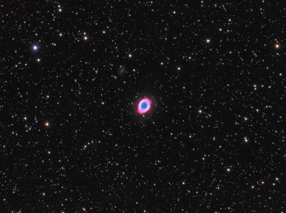 The Ring Nebula is a planetary nebula formed from the collapse of a sunlike star, several times bigger than our own Sun, that released its mass into the surrounding space at the end of its lifetime. The core remnant of the star remains in a planet-sized white dwarf located in the centre of the nebula with a temperature of over 100,000K. This hot central star emits intense ultra-violet light that ionises the atoms in the surrounding gas, resulting in the beautiful elemental colours.