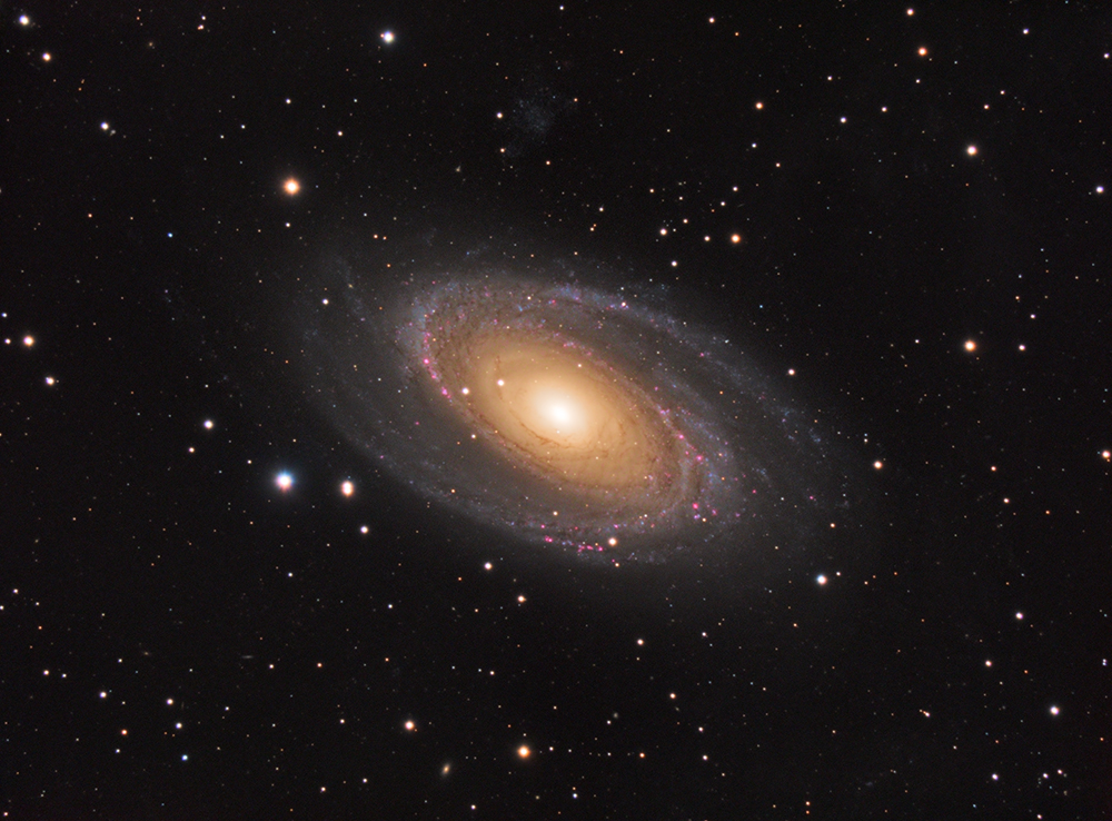 The galaxy’s blueish tinge, mostly around the edges, has been associated with its starburst characteristic as stars are being formed at a rapid rate. The multitude of pinky red star forming HII regions can easily be seen throughout the galaxy's spiral arms. It is interesting to note that Bode’s Galaxy is very similar to the Milky Way as they both contain approximately the same number of stars, at around 250 billion, and they share a similar spiral shape. Unusually, the rotation curve of M81 falls off with distance in the outer regions of the galaxy, suggesting that M81 does not contain as much dark matter as most galaxies.