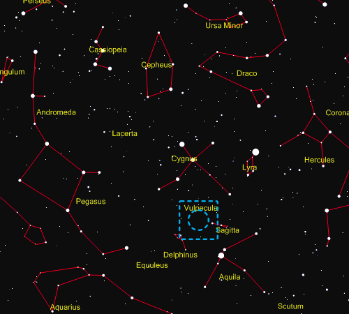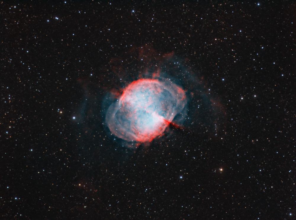 The Dumbbell Nebula was first recorded by Charles Messier in 1764, number twenty seven in his catalogue, it is also known as M27. It is classified as a ‘planetary nebula’, the name invented twenty years later, in 1784, by William Herschel for this class of objects because he found them to resemble his newly discovered planet, Uranus. So, while called a planetary nebula, it has nothing to do with any planet. It was the first planetary nebula ever to be discovered. There are several other names by which this nebula is known; The Diabolo and The Apple Core being two such examples, both on account of the distinctive shapes within the nebula.