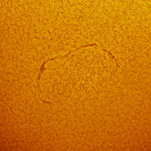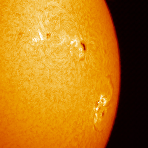 Active regions, or sun spots, show as dark patches on the Sun's surface. They are cooler than their surrounding area and appear darker to us, though they are still white hot! Sun spots develop due to magnetic field flux that inhibits the convection of the plasma columns. They usually appear in pairs of opposite magnetic polarity. Sunspots are temporary phenomena, lasting from a few days to a few months. They are dynamic regions that are in constant change and make for fascinating images. It is possible to see a darker central portion known as the 'umbra', with a slightly lighter surrounding area called the 'penumbra'. The lightest, almost white, areas around the sun spots are called 'plages'.