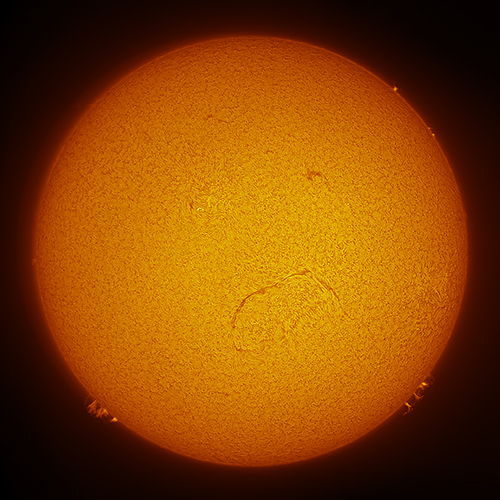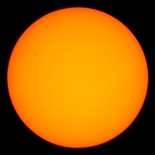 A white light image is created by collecting the full visible spectrum of light emitted by the Sun's photosphere. It is essential to ensure that the correct solar filters are in place before even considering pointing a telescope at the Sun. Don't forget to cover up the finderscope too! Generally the photosphere appears fairly smooth, though some slight granulation might be visible. The only features observed in white light are active regions, more commonly known as sun spots. In fact, there is a small active region visible in the image shown here. All the images I take of the Sun are in monochrome. They are coloured in post-production with the best approximation of the colour of the Sun.