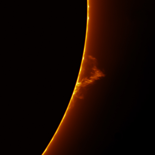 What do you call a prominence when it is over the Sun's surface rather than at the edge or limb? A filament! They are dark lines across the surface of the Sun's disk. In reality they are of course reaching out towards us above the surface of the Sun. They create majestic shapes that are beautifully photogenic. It is even possible to have a 'fila-prom' when a filament extends across the Sun's surface, reaching the limb and continues out into the corona as a prominence. Some prominences break apart and may then give rise to coronal mass ejections.