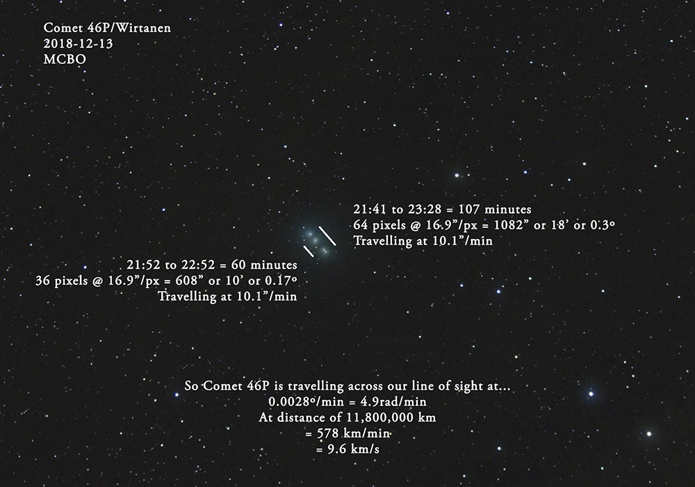 I thought it would be interesting to see if I could calculate how quickly comet 46P/Wirtanen appeared to be travelling across our line of sight, using the data shot to create a widefield image. I worked out the resolution of the image in arcseconds per pixel and by measuring pixels between the comet at known times, I was able to do a little bit of mathematics to calculate a speed of 9.6 km/s, which I am happy to report concurs with the published data about the comet.