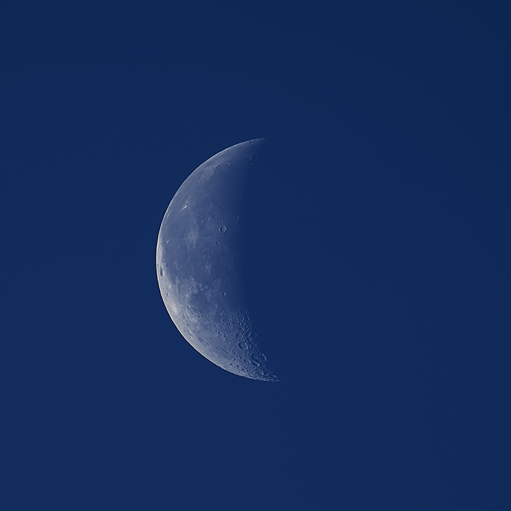 I was recently asked about the best way to photograph the Moon with a DSLR. It has been a long time since I did that, so I decided to have a go. On the morning of 10th January 2018, the waning 36% Moon was clearly visible in the morning light and I set up my Canon EOS 1Dx on a tripod in the garden. I took plenty of frames and stacked the best 100 in Autostakkert. Final processing was done in Photoshop. I am happy with the result and particularly like the blue morning sky and subtle presence of the waning Moon.