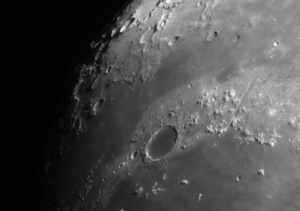 Here is an image of the northern area of the Moon with the large crater Plato residing between the Mare Imbrium, above, and Mare Frigoris below. Plato is about 110 km across. To the right of Plato is Montes Alpes with Vallis Alpes, the obvious valley running through the mountains. The collection of peaks in the Mare Imbrium below Plato are called Montes Teneriffe.