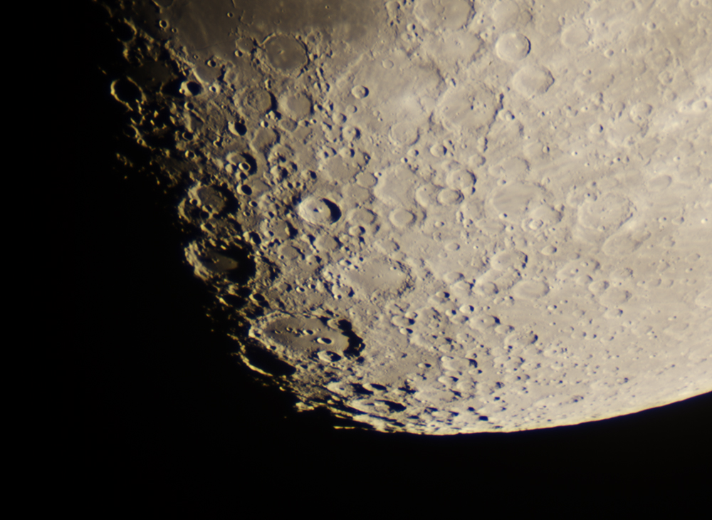 The large crater with a sweep of smaller craters across it is Clavius. The rays from the crater Tycho are quite apparent in the upper right quadrant of this image.