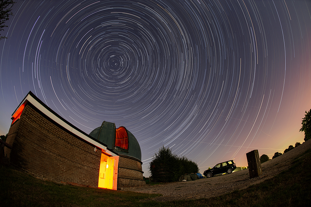 While working in the Marlborough College Blackett Observatory, using the 10" Thomas Cooke refractor housed there to image Mars, I set up my Canon EOS 1Dx with a 15mm fisheye lens on a low tripod and took a series of 3 minute exposures over a period of about two and a quarter hours. I wasn't entirely sure how the image would come out, but as I started to put the image together I liked what was appearing!
